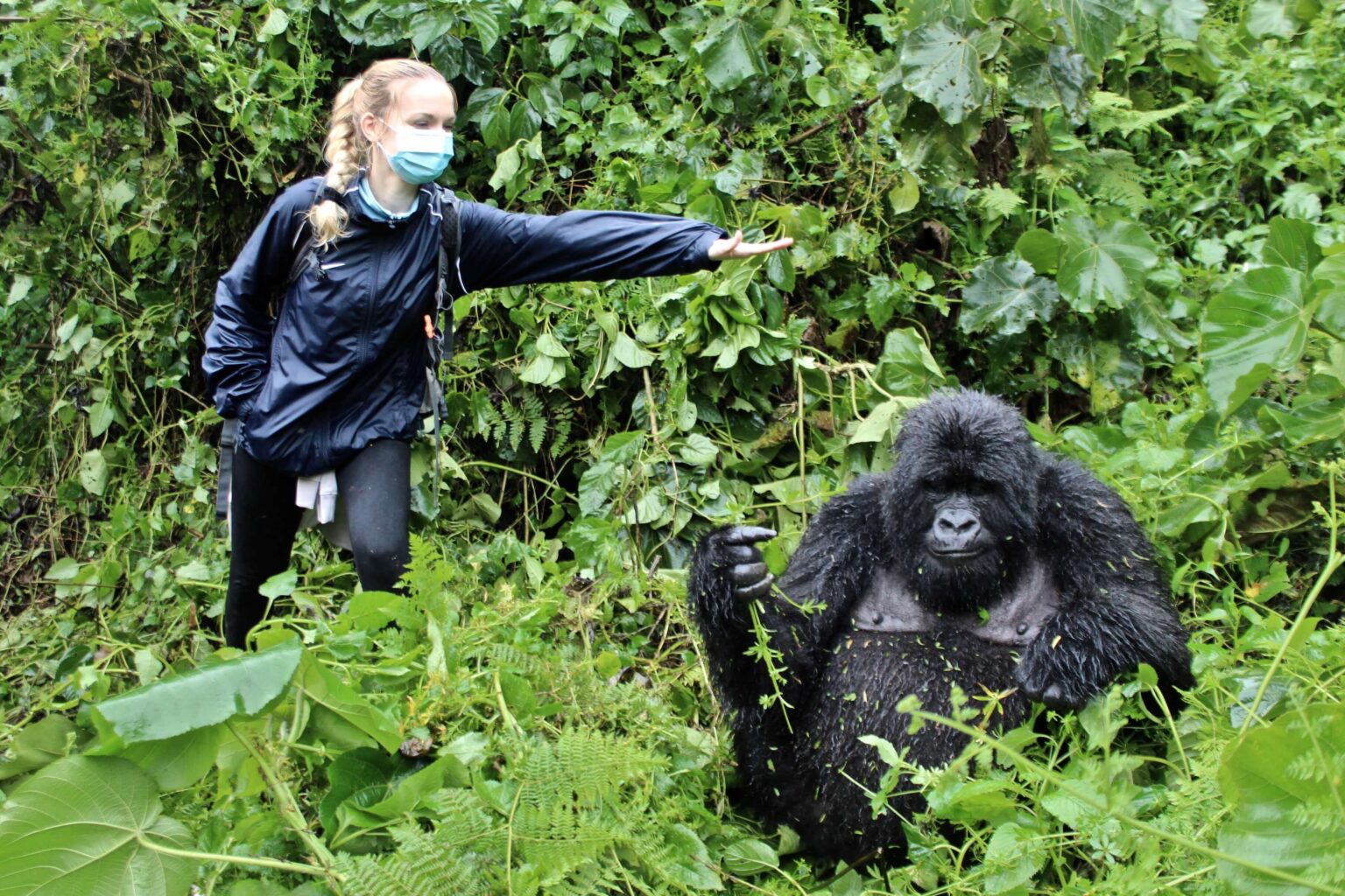 Čas nasadiť si na tvár chirurgickú masku. S gorilami máme spoločných vyše 95% DNA, čo okrem iného znamená aj to, že sme náchylní na rovnaké ochorenia. Aby sme sa teda vzájomne náhodou niečím nenakazili, je povinné v prítomnosti goríl nosiť na tvári masku. My, Francúzi a rangeri máme masky chirurgické, čo sme dostali ešte pred vstupom do lesa, Číňania majú vlastné, čierne, z nejakého čudného materiálu.