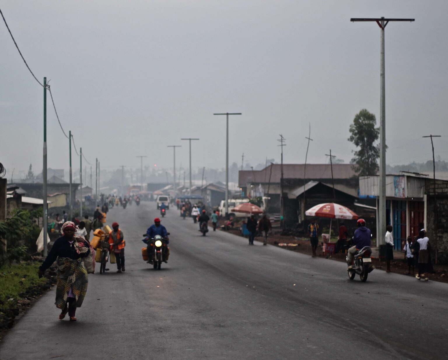Definitívne opúšťame Gomu. Pri ceste stojí tabuľa, kde je farebne vyznačená aktivita neďalekého stále aktívneho vulkánu Nyiragongo, ktorý za posledných 40 rokov dva razy pochoval mesto Goma pod vrstvu lávy, spolu s pokynmi vo francúzštine, ako postupovať pri hroziacej erupcii. Rušné ulice sa pomaly menia na ojedinelé malé obchodíky pri ceste a autá a motorky nahrádzajú unikátne drevené trojkolky. Pod úpätím sopky Nyiragongo sa asfaltová cesta mení na poľnú. S dierami do výšky kolien, blatom, mlákami a ostrými kameňmi. Prejsť nasledujúcich 30 kilometrov nám zaberá vyše hodiny, každých pár kilometrov vidíme malé stany, pred ktorými sedia dvaja – traja vojaci. Pri chaotickej politickej situácii v Kongu možno len ťažko povedať, kto je „zlý a dobrý“, pretože svoju pravdu majú aj vláda a vojaci, aj OSN, aj rebeli a povstalci. Pýtame sa teda Baracka, či vojaci nie sú nepríjemní na civilistov, prípadne turistov. „Noooo, they are good. Very stupid,“ uznanlivo odpovedá Barack.