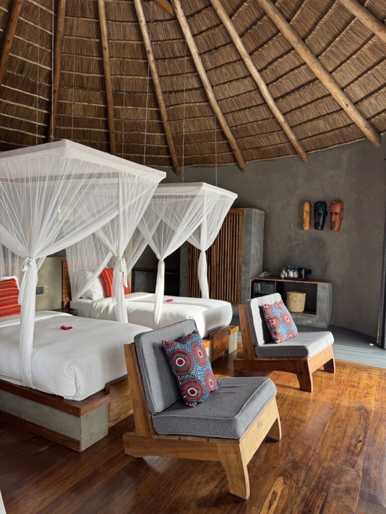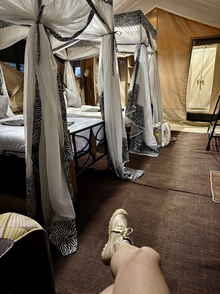A potom sú tu stanové kempy, ktoré nie sú „stan“ v klasickom zmysle slova, ale skôr luxusné safari stany s normálnou posteľou, vlastnou sprchou a toaletou. A zároveň si stále uprostred divočiny. V noci počuješ zvuky prírody – smiech hyen, pohyb zvierat, vzdialené hlasy hrochov. Je to presne ten typ ubytovania, ktorý ťa neruší od zážitku, ale ho ešte viac umocňuje.