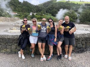 Navštívime „dymiacu“ dedinku Furnas, ktorá patrí medzi najzaujímavejšie miesta na celom ostrove. Všade navôkol uvidíme syčiace fumaroly, bublajúce bahenné jazierka a stúpajúcu paru – živý dôkaz toho, že ostrov stále formuje sopečná energia. Ochutnáme tu aj tradičné azorské jedlo Cozido, ktoré sa pripravuje priamo v horúcej sopečnej zemi. Hrniec s mäsom a zeleninou sa zahrabe do geotermálneho podložia, kde sa jedlo niekoľko hodín pomaly dusí. Pozrieme si aj samotné miesto, kde sa Cozido varí – rad po sebe zoradených otvorov v zemi, z ktorých stúpa para a ktoré miestni používajú ako „prírodnú kuchyňu“. Po gurmánskom zážitku nás čaká relax vo Furnas: okúpeme sa v prírodnom termálnom kúpalisku známeho svojou oranžovo-hnedou, železitou vodou, ktorá má blahodarné účinky na pokožku a dýchacie cesty. Kúpanie v horúcich bazénoch uprostred tropickej zelene patrí medzi najpríjemnejšie momenty celého dňa.