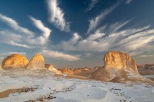 Vydávame sa preskúmať unikátne púšte Sahary a začínam Čiernou púšťou. V tejto bývalej sopečnej oblasti sa nachádza veľa čiernych kopcov, pri ktorých nadobudnete pocit, ako by ste boli na ine planéte. Po obede u Beduínov nasleduje Kryštálová hora, na ktorej ako už názov napovedá, nájdete prírodne vytvorené kryštály. Na záver dňa prichádzame do Bielej púšte s nádhernými vápencovými útvarmi vystupujúcimi z piesku. Toto je miesto, kde prespíme pod holým nebom a zažijeme tie najkrajšie chvíle ďaleko od civilizácie.