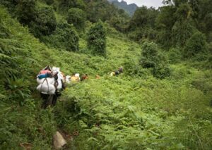 Po výdatných raňajkách začneme chôdzou po dne údolia cez vysoké lesné stromy ,,Afro Montane Forest Zone”. Toto je stabilné stúpanie s možnosťou vidieť množstvo vtákov a je šanca, že uvidíme aj opice uháňajúce lesom. Ak budeme mať šťastie tak sa môžu okolo nás prehnať tlupy čiernych a bielych opíc Colobus, ktoré sa radi hojdajú cez koruny stromov. Zriedkavo sú pozorované opice L’Hoest, ktoré sú súčasťou kultúrnych znakov Bukonzo a sú chránené cnosťou kráľa. Okrem tohto je možné v diaľke počuť divokého šimpanza. Existuje tu široká škála rastlinných druhov od lesných stromov po bambusové húštiny, nízke kríky, kvety, huby, mnohé machy a lišajníky ktorými sú pokryté vysoké stromy. Všetko umocnia aj vodopády Enock. Prejdeme ďalšou zónou ,,Bamboo-Mimulopsis zone” ktorej dominujú rôzne druhy bambusov. Utáboríme sa v campe Kalalama vo výške 3134 m n. m. Celkový čas: cca. 8-9 h Celkové prevýšenie: 1684 m Celková vzdialenosť: 11.3 km
